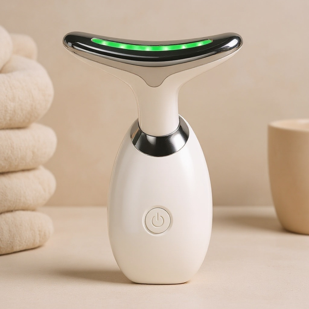 Desliza suavemente el aparato de masaje por el rostro durante 8–10 minutos con movimientos ascendentes. El LED rojo estimula la producción de colágeno, mientras que las vibraciones tensan y alisan la piel.